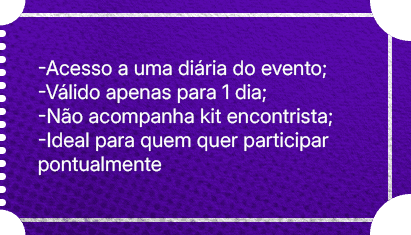 Mas se só quer participar de um ou dois dias, não tem problema! Os Ingressos Diários te permitem escolher os dias que mais combinam com você.